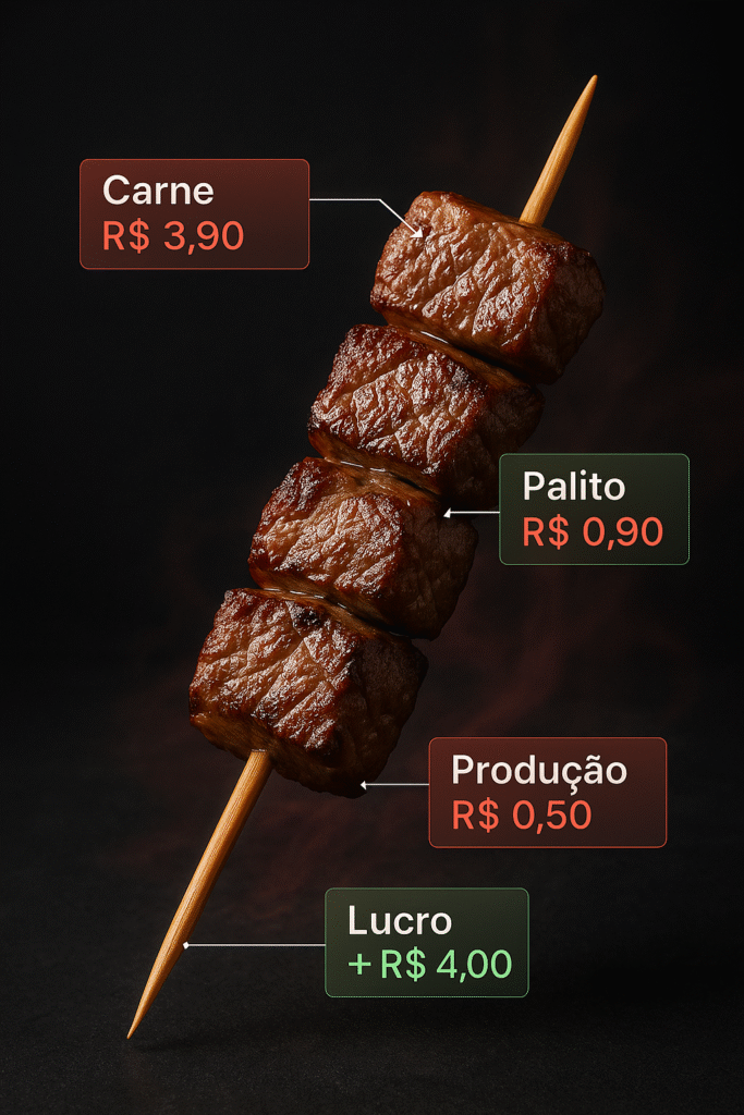 Itens invisíveis: custos com embalagens, papel alumínio e onde comprar espeto pronto.